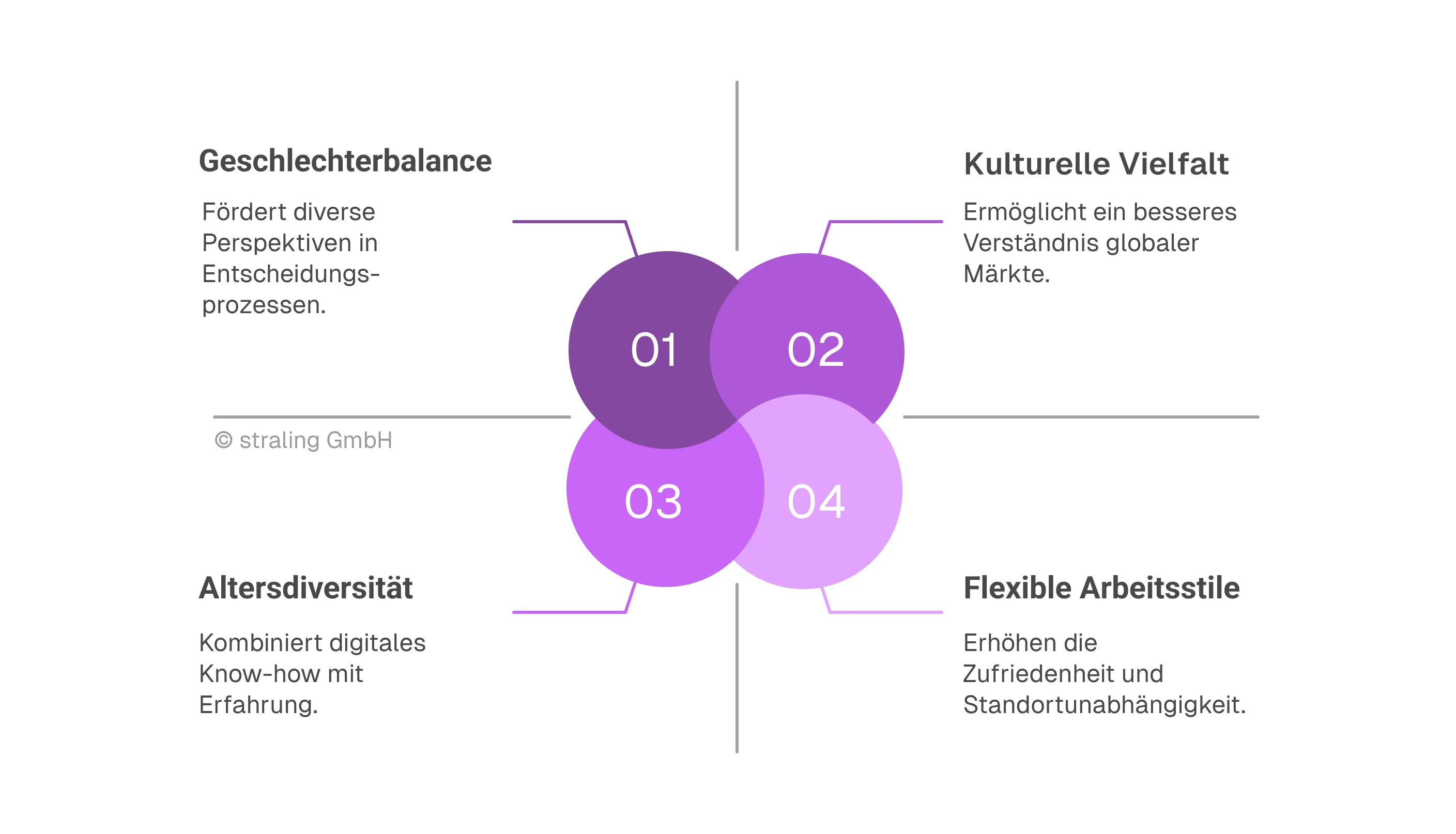 - Altersdiversität: Unterschiedliche Generationen vereinen frische Impulse, digitale Kompetenz und bewährtes Fachwissen. Diese Kombination kann den Lernprozess innerhalb des Teams beschleunigen und neuen Ideen den Weg ebnen.
